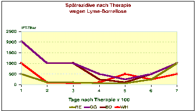 Andererseits können bei der ACA, die einen Verlauf von Jahrzehnten haben kann, noch Borrelien aus Hautbiopsien angezüchtet werden. In solchen Fällen kann der direkte Erregernachweis als Therapiekontrolle dienen. Inzwischen gibt es in jedem Krankheitsstadium und bei jeder Manifestation Berichte über eine erfolgreiche Erregeranzucht. Es ist also davon auszugehen, daß die Erreger der Borreliose chronisch persistieren können. Früher wurde oft argumentiert, die Borreliose habe eine hohe spontane Heilungsquote und die nachweisbaren Antikörper seien nur Ausdruck einer früher durchgemachten Erkrankung. Heute wissen wir, daß auch in den chronischen Stadien mit zum Teil jahrelangem Verlauf noch Erreger anzüchtbar sind. (Wir haben bei einem Patienten mit einem disseminierten Lymphom noch nach sieben Jahren den Erreger nachweisen können; bei einem anderen Patienten überlebten kultivierbare Borrelien in der Haut trotz viermaliger hochdosierter intravenöser Therapie).